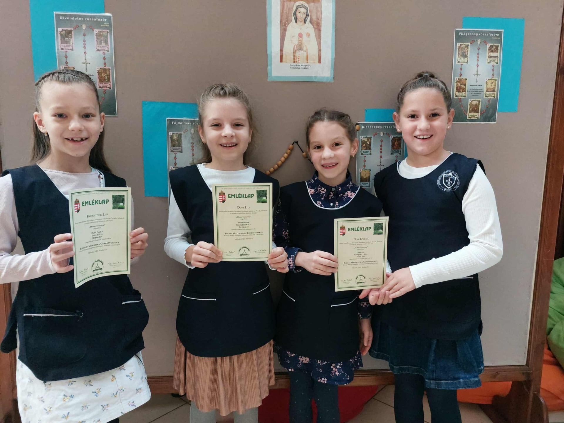 Bolyai matematika csapatverseny Borsod-Abaúj-Zemplén vármegyei 2. helyezett (és ezzel döntős) a Szent Imre "Harmatcseppek" csapata.Dobi Dorka 3.b, Dobi Lili 3.b, Kosnyider Lili 3.b, Répás Zoé 3.b