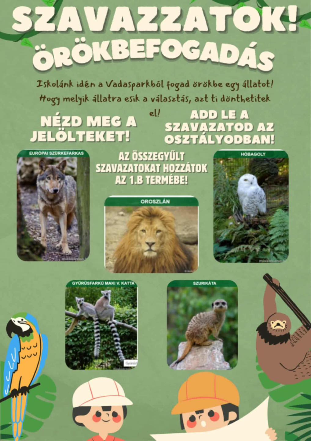 Hatalmas örömmel osztjuk meg veletek, hogy közös összefogással örökbefogadtuk a Miskolci Állatkert szurikátáit! Köszönjük a gyerekek lelkes részvételét a szavazásban és a szülők nagylelkű támogatását! Együtt tettük lehetővé, hogy egy kis csapat szurikáta még több szeretetet és gondoskodást kapjon!